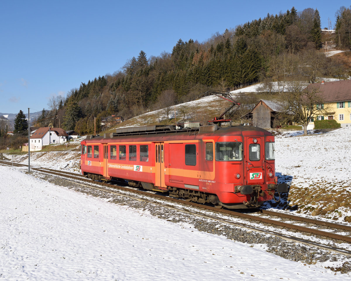 Am frühen Morgen des winterlichen 7. Januars war der ehemalige SZU BDe 4/4, und seit 1994 auf der steirischen Übelbacherbahn beheimatete StB ET 15 als R 87604 nach Peggau-Deutschfeistritz unterwegs und wurde von mir in Waldstein fotografiert.