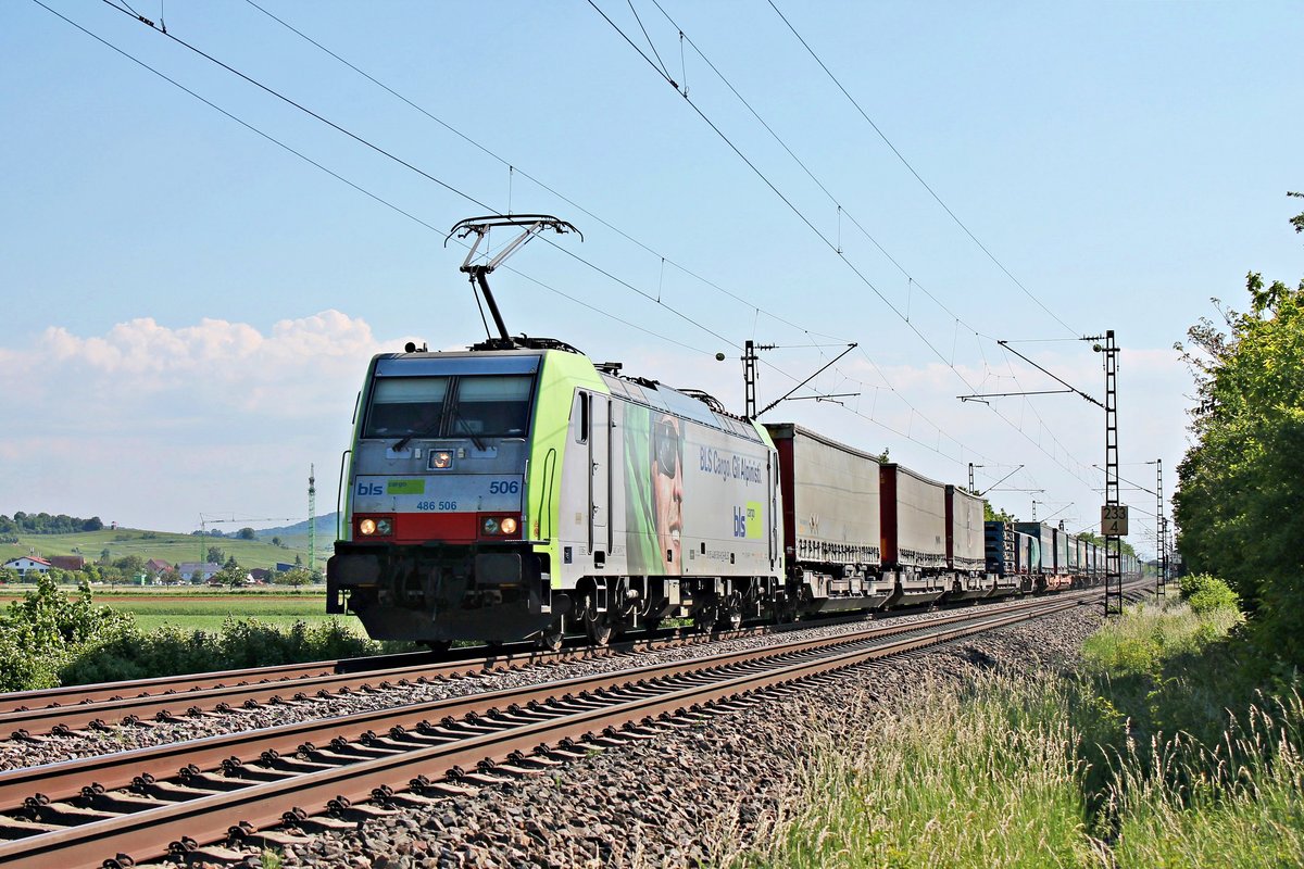 Am Nachmittag des 19.05.2020 fuhr Re 486 506 "BLS Cargo. Gli Alpinisti." mit dem "T.T.S."-KLV nach Belgien, welchen sie bis Aachen West bespannte, nördlich von Hügelheim über die Rheintalbahn durchs Markgräflerland in Richtung Buggingen.