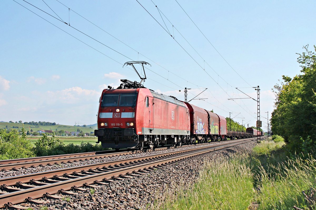 Am späten Nachmittag des 19.05.2020 fuhr 185 119-5 mit dem EZ 45000 (Chiasso Smistamento - Mannheim Rbf) nördlich von Hügelheim durchs Rheintal in Richtung Freiburg (Breisgau).
