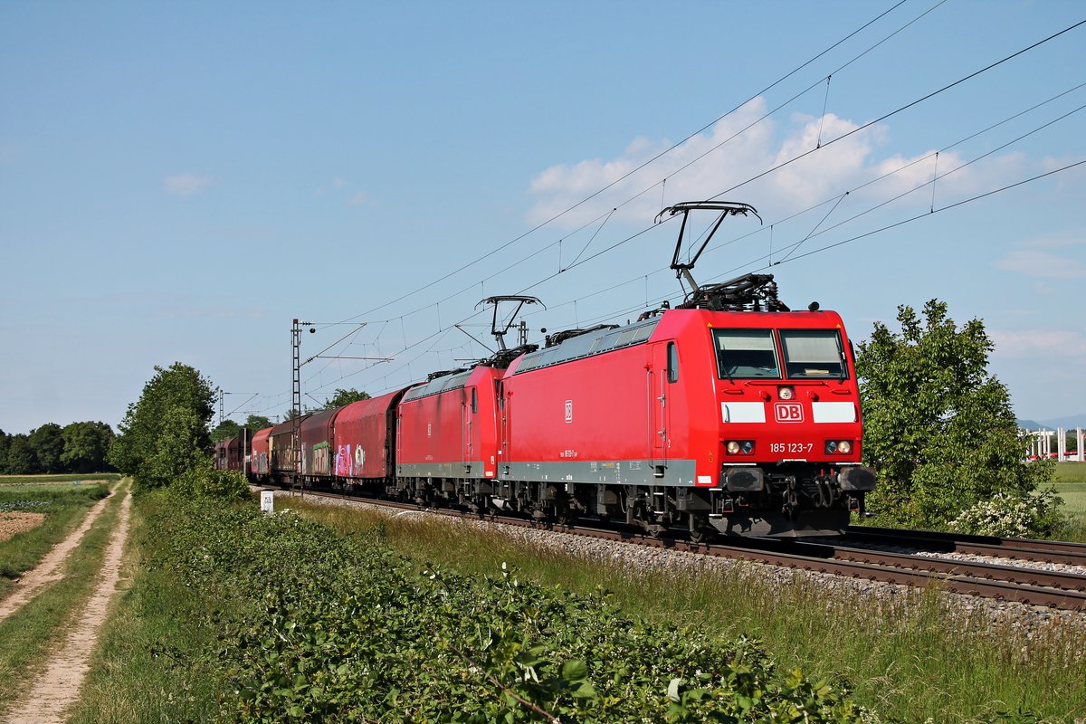 Am späten Nachmittag des 19.05.2020 fuhr 185 123-7 zusammen mit 185 093-2 und dem EZ 45023 (Mannheim Rbf - Chiasso Smistamento) aus Richtung Freiburg (Breisgau) kommend bei Buggingen über die KBS 702 gen Müllheim (Baden).