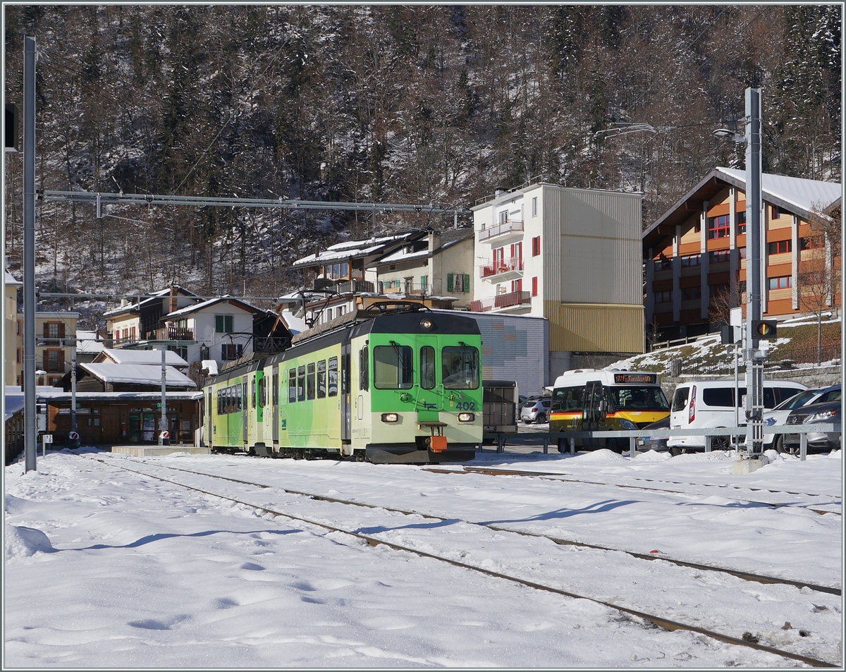 Ein TPC /A-L Regionalzug bestehend aus dem AL Bt 352 und dem schiebenden BDeh 4/4 301 erreicht von Leysin kommend den Halt Aigle Place du Marché. 3. Januar 2021