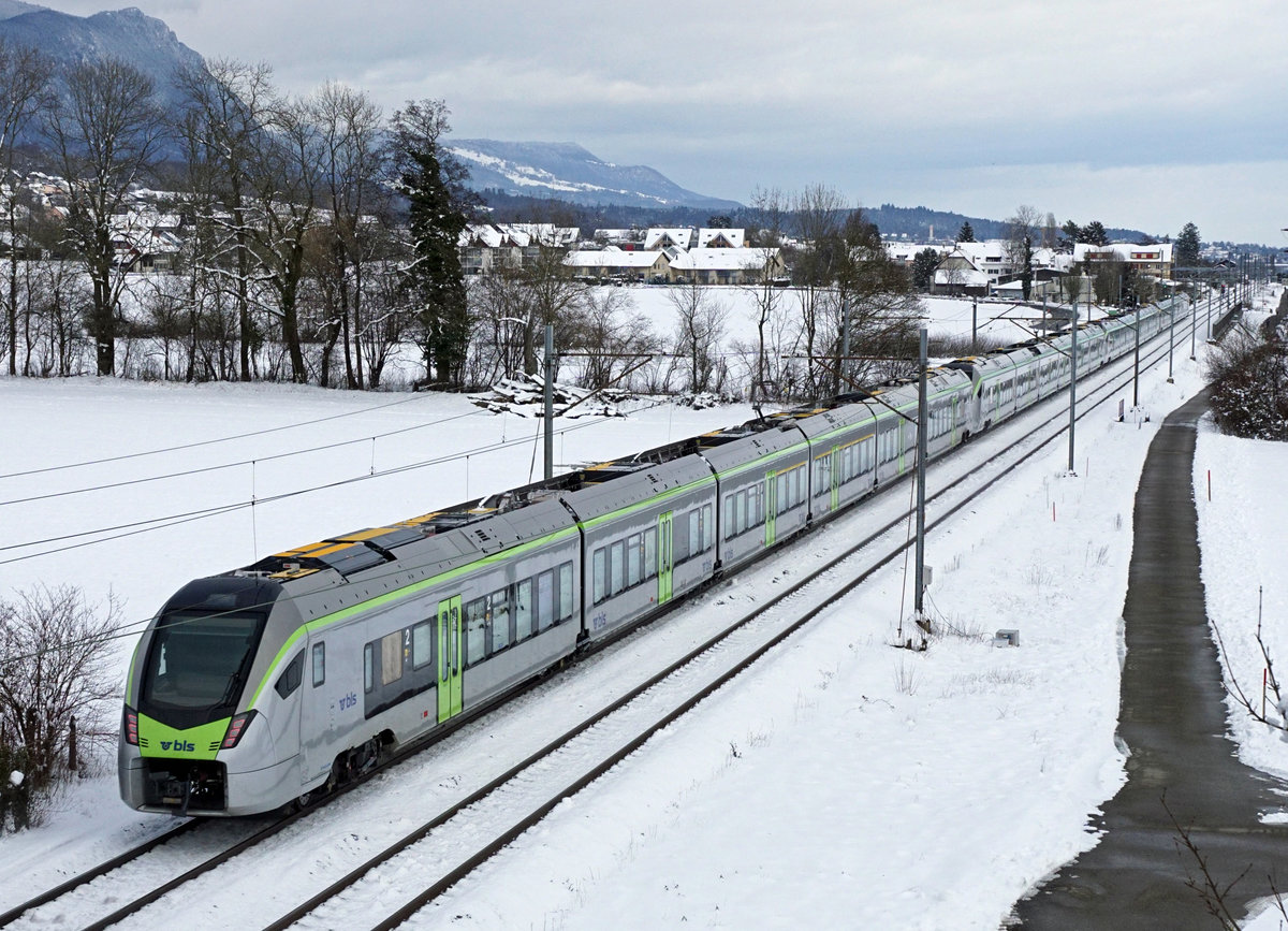 BLS RABe 528 Testfahrten auf dem Streckenabschnitt Solothurn-Grenchen Süd am 26. Januar 2021. Zum Einsatz gelangten Zwei- und 4-teilige MIKA mit einer Länge von rund 105 Meter, von denen die BLS 58 Stück bestellt hat. Vier MIKA vereint zwischen Bettlach und Selzach. Foto: Walter Ruetsch