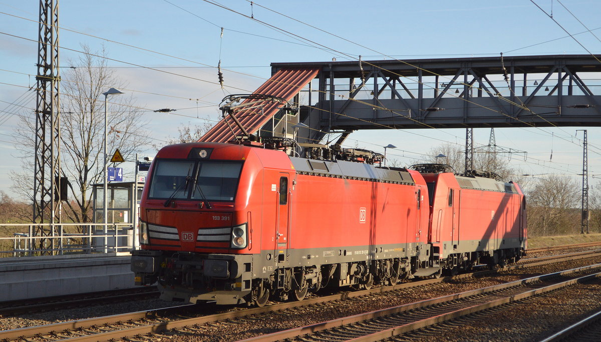 DB Cargo AG [D] mit  193 391  [NVR-Nummer: 91 80 6193 391-0 D-DB] und   185 393-6  [NVR-Nummer: 91 80 6185 393-6 D-DB] am Haken am 21.01.21 Durchfahrt Bf. Saarmund.