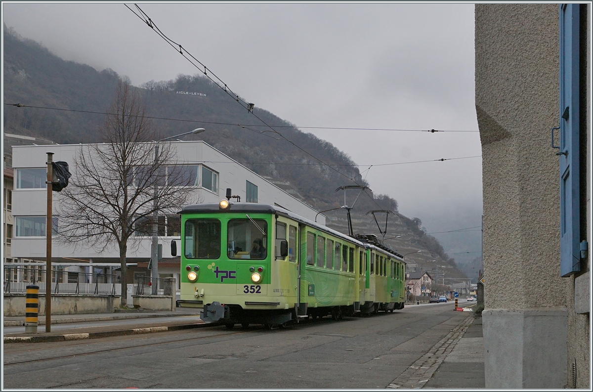 Ein TPC /A-L Regionalzug bestehend aus dem AL Bt 352 und dem schiebenden BDeh 4/4 301 erreicht von Leysin kommend den Halt Aigle Place du Marché.