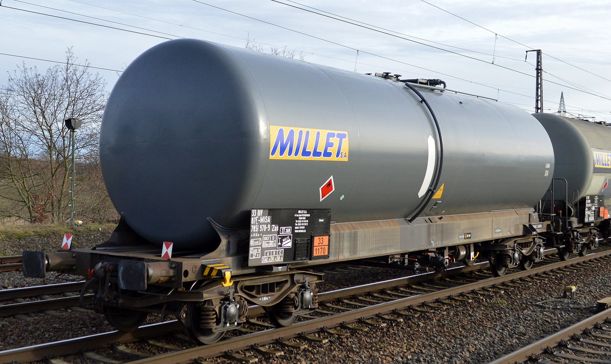 Französischer Kesselwagen vom Einsteller MILLET S.A. mit der Nr. 33 RIV 87 F-MISA 7851 978-9 Zas, Befüllung lt. UN-Nr.: 33/1170 = Ethanol, am 20.01.21 in einem Ganzzug Bf. Saarmund gesichtet.