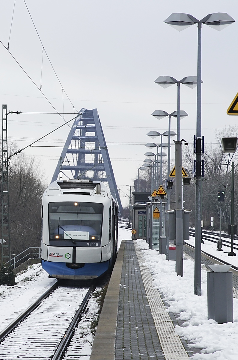 Inzwischen ein alltägliches Bild im Düsseldorfer Raum: Der jetzt von der Regiobahn eingesetzte ex-BOB VT 116 am 24.01.2021 in Düsseldorf-Hamm, im Hintergrund die Rheinbrücke Düsseldorf - Neuss. Die Zielangabe  Kaarster See  ist falsch, der Triebwagen fährt in der Gegenrichtung nach Wuppertal Hbf.. Während meines nicht allzu langen Fototrips fielen übrigens insgesamt 5 S-Bahnen aus (2x S 8, 1x S 11, 2x S 28) und ich lernte dabei die gesamte DB-Poesie kennen:  Verzögerung im Betriebsablauf ,  betriebliche Störung ,  witterungsbedingte Störung ,  Störung am Triebfahrzeug  und  wegen Unfalls .