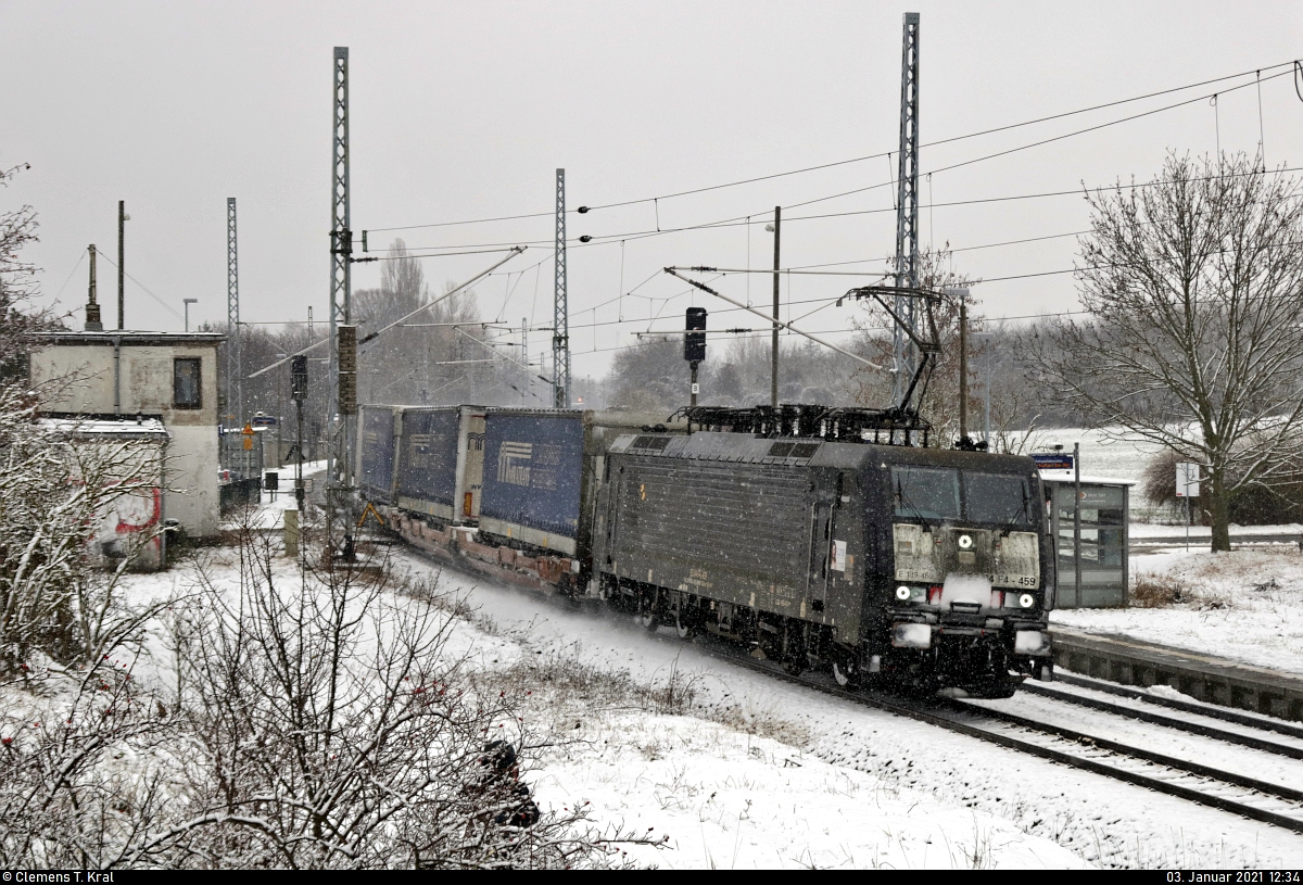 KLV-Zug (Miratrans Transport Spedycja Sp. z o.o) mit 189 459-1 (Siemens ES64F4-459) durchfährt als Umleiter den Hp Zscherben auf Gleis 1 Richtung Teutschenthal. Hinweis: Einige Masten stehen schief, das Bild als Gesamtes sollte hingegen ausgerichtet sein. 🧰 Mitsui Rail Capital Europe GmbH (MRCE), vermietet an die LTE Logistik- und Transport-GmbH (LTE) 🚩 Bahnstrecke Halle–Hann. Münden (KBS 590) 🕓 3.1.2021 | 12:34 Uhr