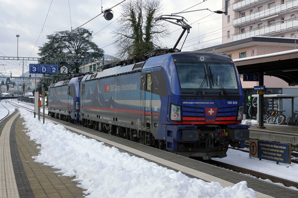 Lokzug bestehend aus zwei blauen Vectron anlässlich der Bahnhofsdurchfahrt Grenchen Süd. Am 26. Januar 2021 wurde diese Doppeltraktion eingeteilt für die Führung vom Kesselwagenzug 48666 ab Cornaux. Foto: Walter Ruetsch