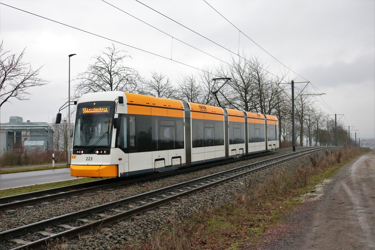 Mainzer Mobilität Stadler Variobahn 223 am 23.01.21 am Lerchenberg als Linie 53
