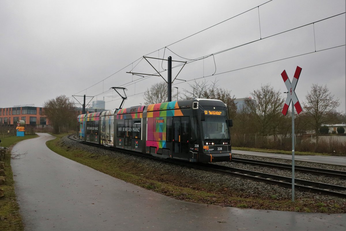 Mainzer Mobilität Stadler Variobahn 228 am 23.01.21 am Lerchenberg als Linie 53