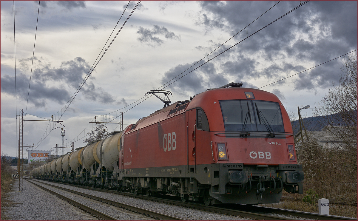 OBB 1216 143 zieht Kesselzug durch Maribor-Tabor Richtung Norden. /21.1.2021