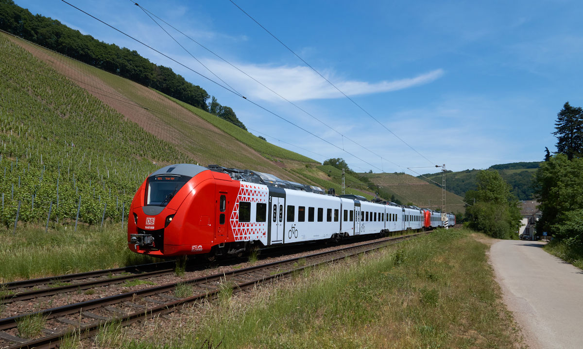 Seit Dezember 2019 ist die Baureihe 425 von der RB71 in Rheinland-Pfalz fast vollständig verschwunden und durch die neuen Coradia Continental der Baureihe 1 440 ersetzt worden. Am 2.6.2020 war 1 440 008 als RB71 auf dem Weg von Saarbrücken Hbf. nach Trier Hbf.. Gerade befindet er sich in der Anfahrt auf den Haltepunkt Kanzem.