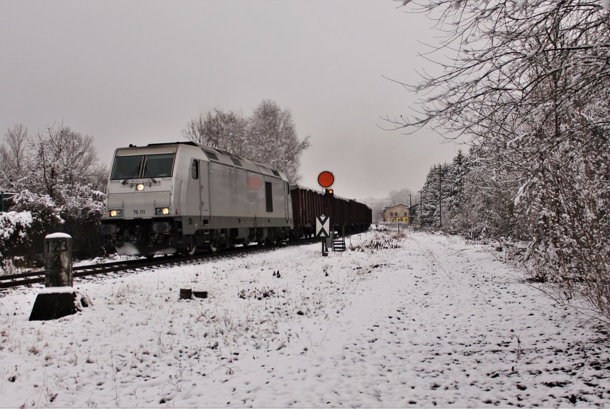 111 027 an erster Stelle des RB6 (München - Garmisch-Partenkirchen). Hinten schiebt 111 031. An diesem Tag wurde die Linie RB6 nur im Zwei-Stunden-Takt gefahren, da die Bahnhöfe, in denen gekreuzt werden sollte, nur eingleisig befahren werden konnten. Die Kreuzungen fanden demnach nur in Murnau statt. Die Takt-Verstärker und die RE-Züge entfielen komplett. Ohlstadt, 18. Januar 2021