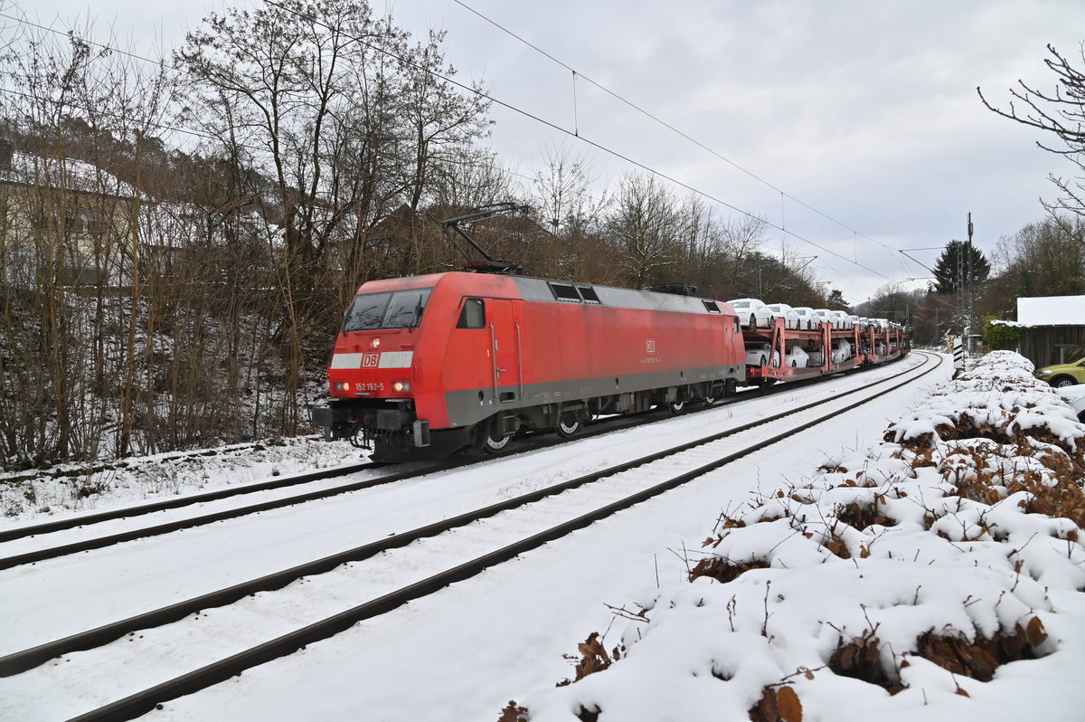 Zwei Spuren im Schnee und ein einsamer Audizug. 152 152-5 zieht den Millionen am heutigen Mittag durch Neckargerach. 26.1.2021