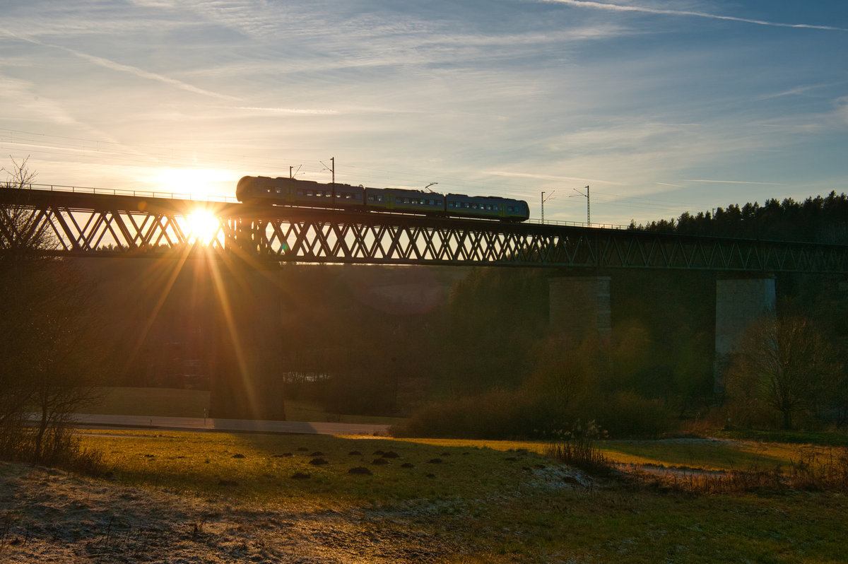 Ein 9442 (Bombardier Talent 2) befährt bei schwachem Sonnenlicht die rund 155 Jahre alte Saalebrücke in Halle-Wörmlitz.