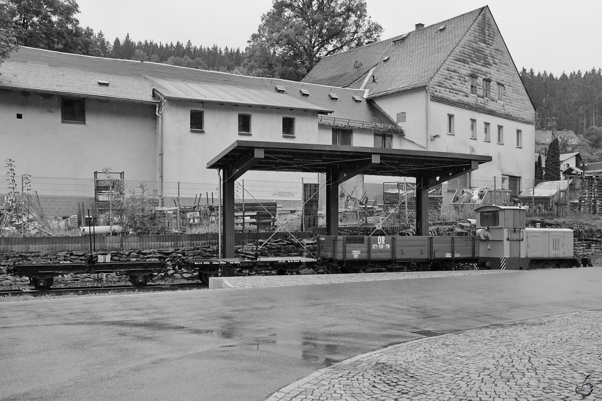 Im sächsischen Schmalspurbahnmuseum Rittersgrün stand Ende September 2020 dieser mit Schienen beladener Rf6-Rollwagen (97-07-60), einer von nur fünf erhaltenen Exemplaren mit sechs Achsen.