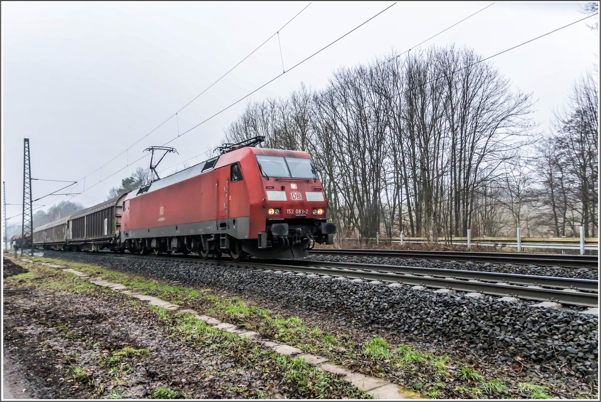 Gemischter Gz mit 152 ??? (Siemens ES64F) fährt in Halle (Saale), Karl-von-Thielen-Straße, auf der Ostumfahrung für den Güterverkehr in nördlicher Richtung.
