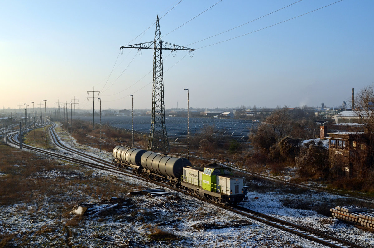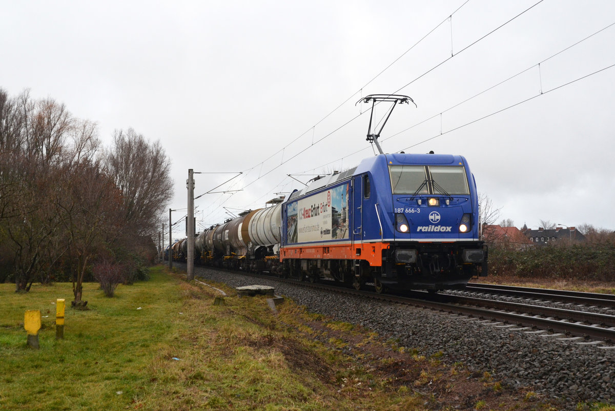 187 666 von raildox schleppte am 06.01.21 einen Güterzug, welcher je zur Hälfte aus Kessel- und Schwenkdachwagen bestand, durch Greppin Richtung Bitterfeld.