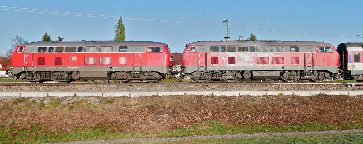 In Hergatz ziehen 218 433-1 und 218 422-4 am 27.11.2020 die von Basel SBB kommenden Wagen des EC 191 über die bayerische Allgäubahn nach München.