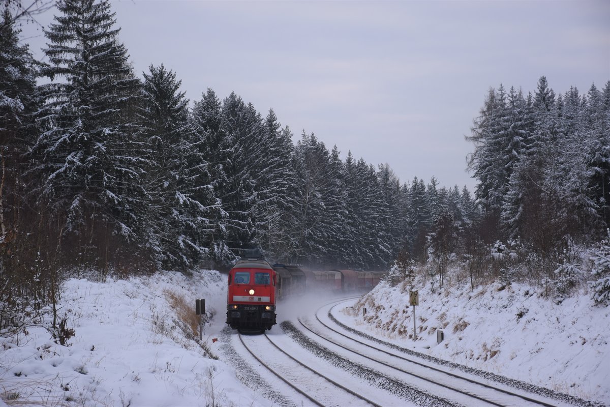 Der RE nach Nürnberg bekam am 10.01.2020 sogar etwas Sonne ab, als er bei Martinlamitz durch den schmelzenden Schnee fuhr.