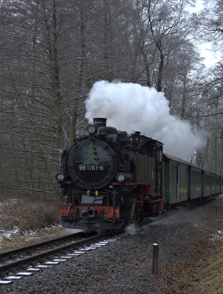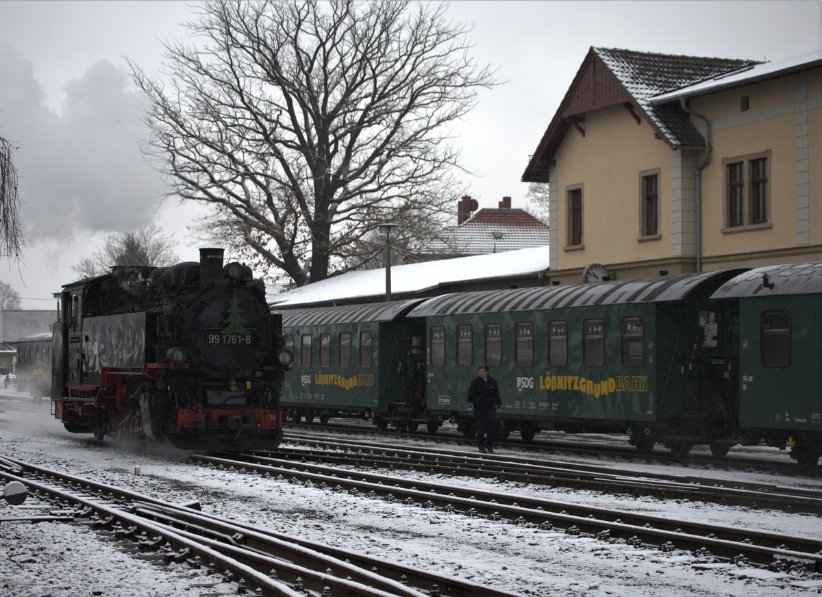 99 1761-8 mit einem kurzen Zug bei Berbisdorf,auf dem Weg nach Radeburg. 10.01.2020 10:37 Uhr. Trübes Wetter, trübe Stimmung, einige wenige Fahrgäste sind auszumachen.