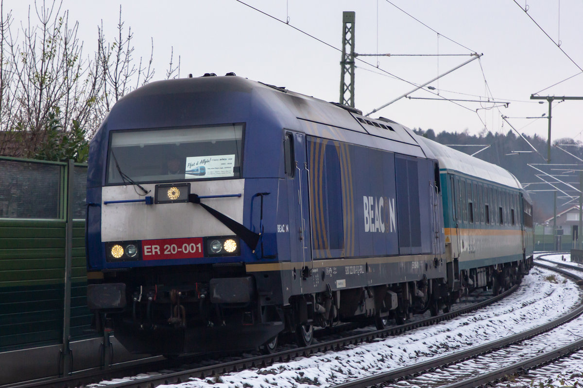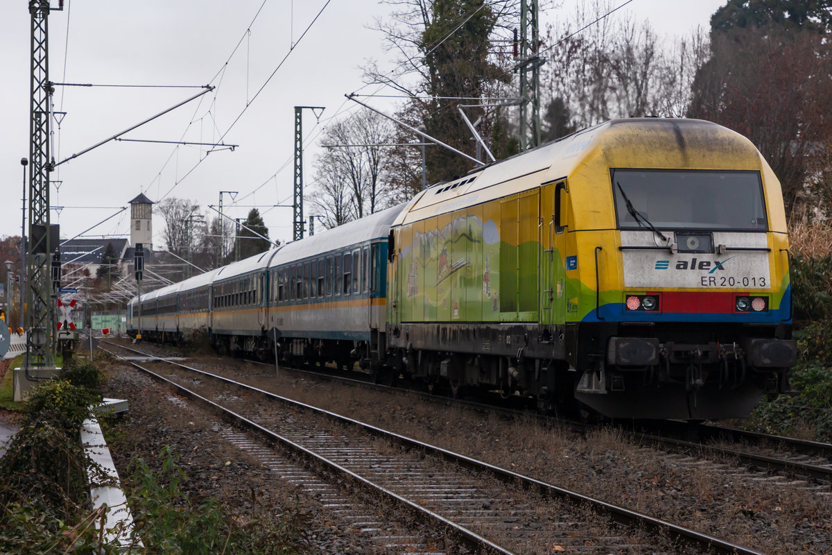 Der EC nach Hamburg durchfährt die Oberauer Kurve. Kilometer 20.4 10.01.2020 11:14 Uhr. Trübes Nieselwetter.