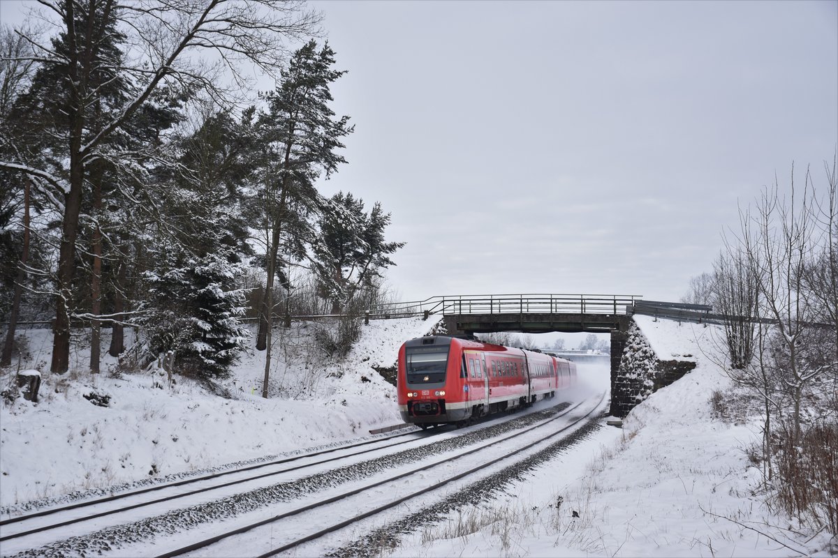 Am Vormittag des 10.01.2021 staubt der RE nach Nürnberg an einer der alten Brücken bei Martinlamitz vorbei.