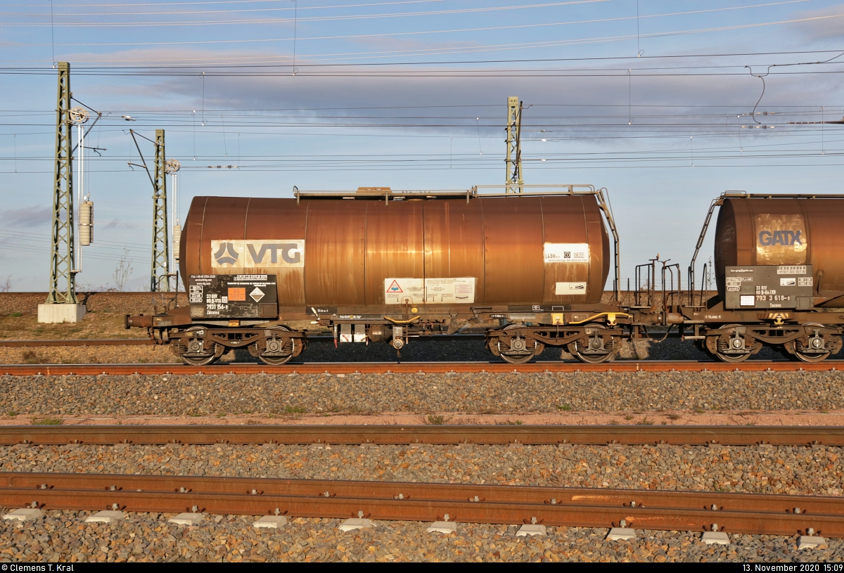 Blick auf einen Kesselwagen für Natriumhydroxidlösungen (80 - ätzender oder schwach ätzender Stoff) der Gattung "Zacens" (37 80 7931 156-9 D-VTG), der in einem Kesselzug mit 187 110-2 und 187 162-3 in Halle (Saale), Karl-von-Thielen-Straße, auf der Ostumfahrung für den Güterverkehr in südlicher Richtung fährt.