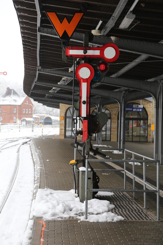 Ein kurioses kleines HP 2 Flügelsignal steht hier am 6.1.2021 noch immer in Funktion auf dem Hausbahnsteig des Bahnhof Goslar!