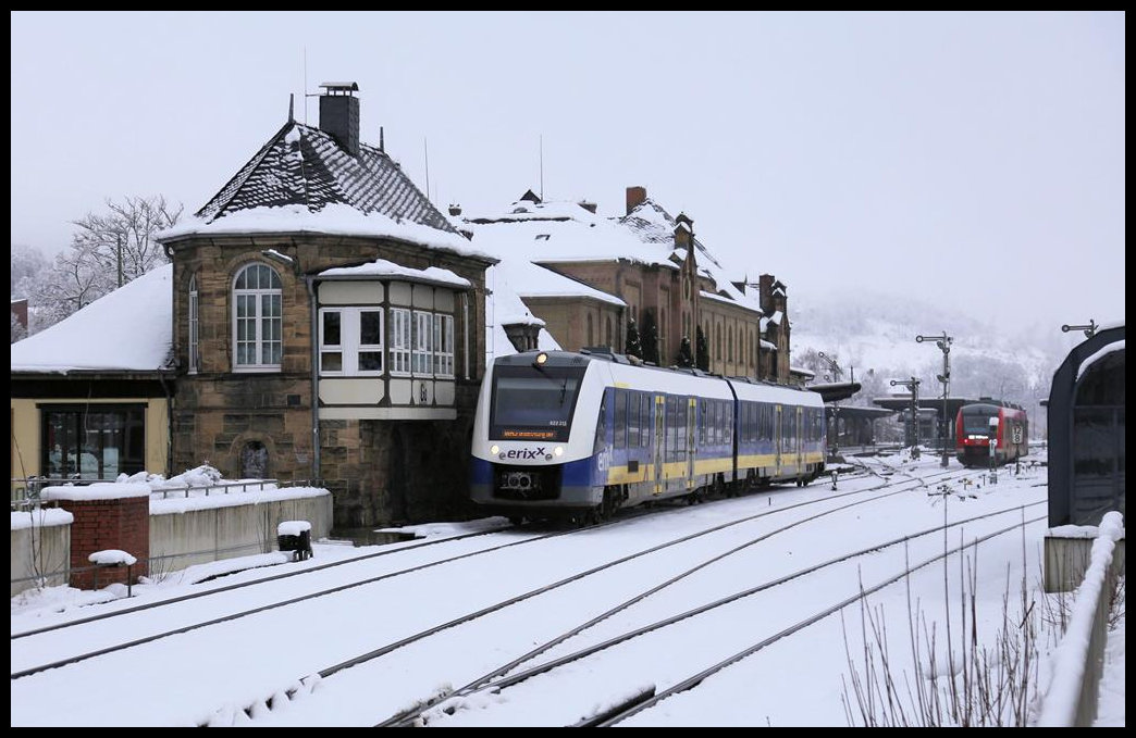 Erixx VT 622211 passiert hier beim Verlassen des Bahnhof Goslar das alte Stellwerk nahe dem Hauptgebäude. Der Zug ist am 6.1.2021 um 13.47 Uhr unterwegs nach Braunschweig.