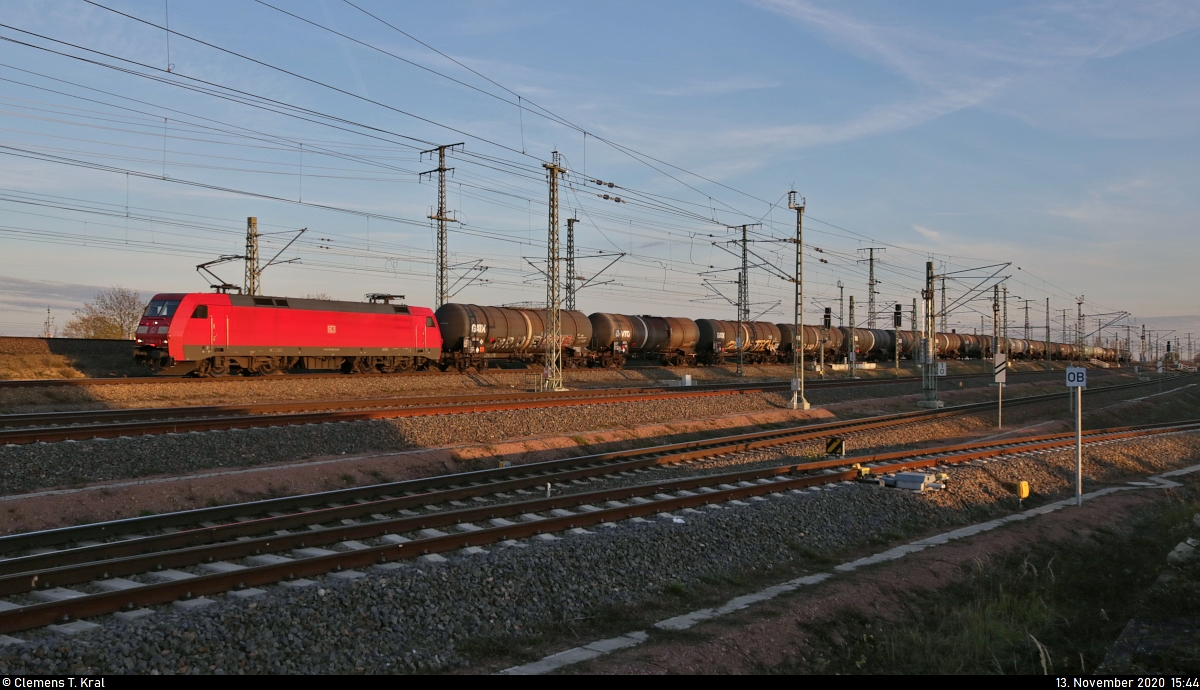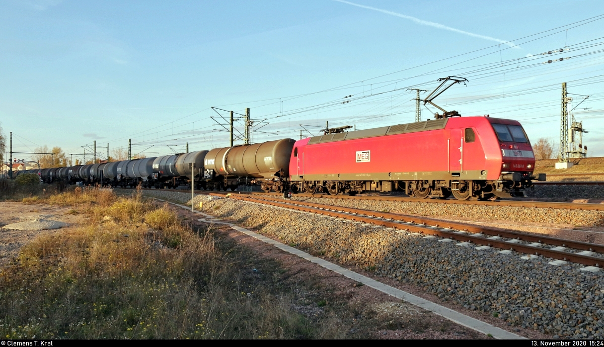 Kesselzug mit 145 061-8 fährt in Halle (Saale), Karl-von-Thielen-Straße, auf der Ostumfahrung für den Güterverkehr Richtung Leipzig.