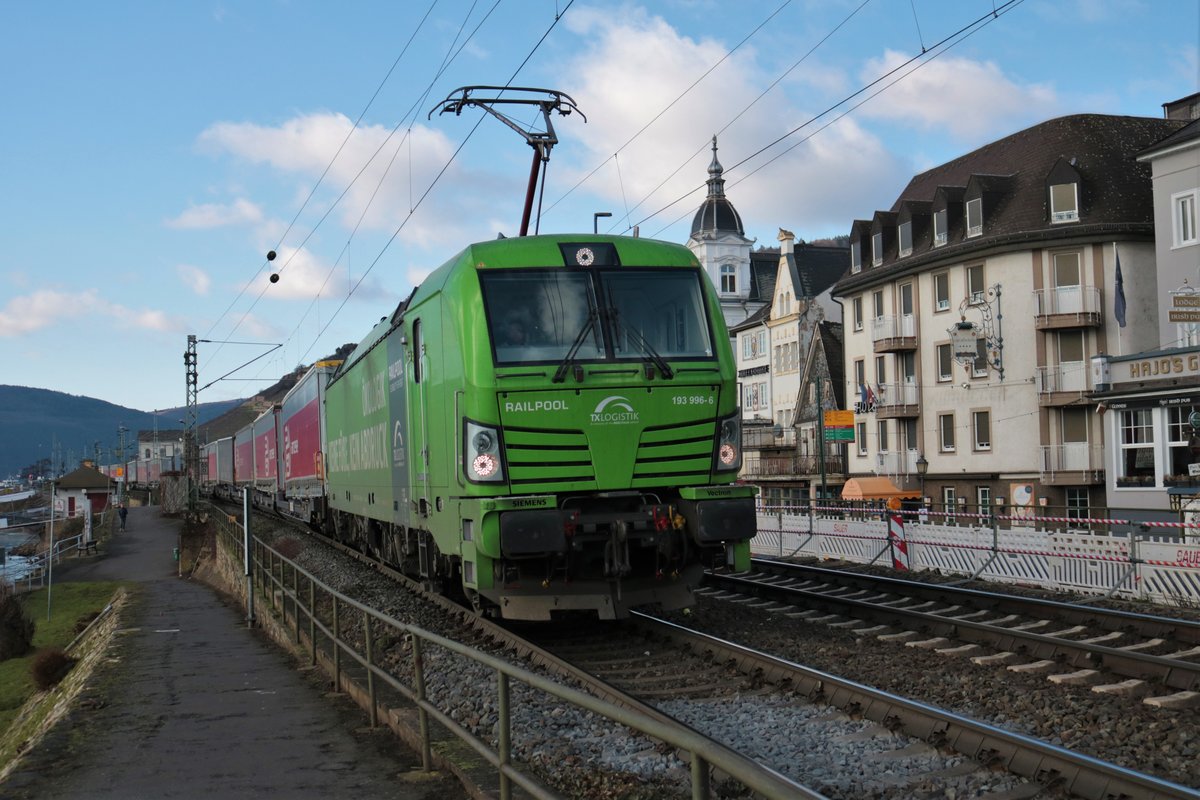 Railpool/TX Logistik Siemens Vectron 193 996-6 mit KLV Zug am 09.01.21 in Rüdesheim