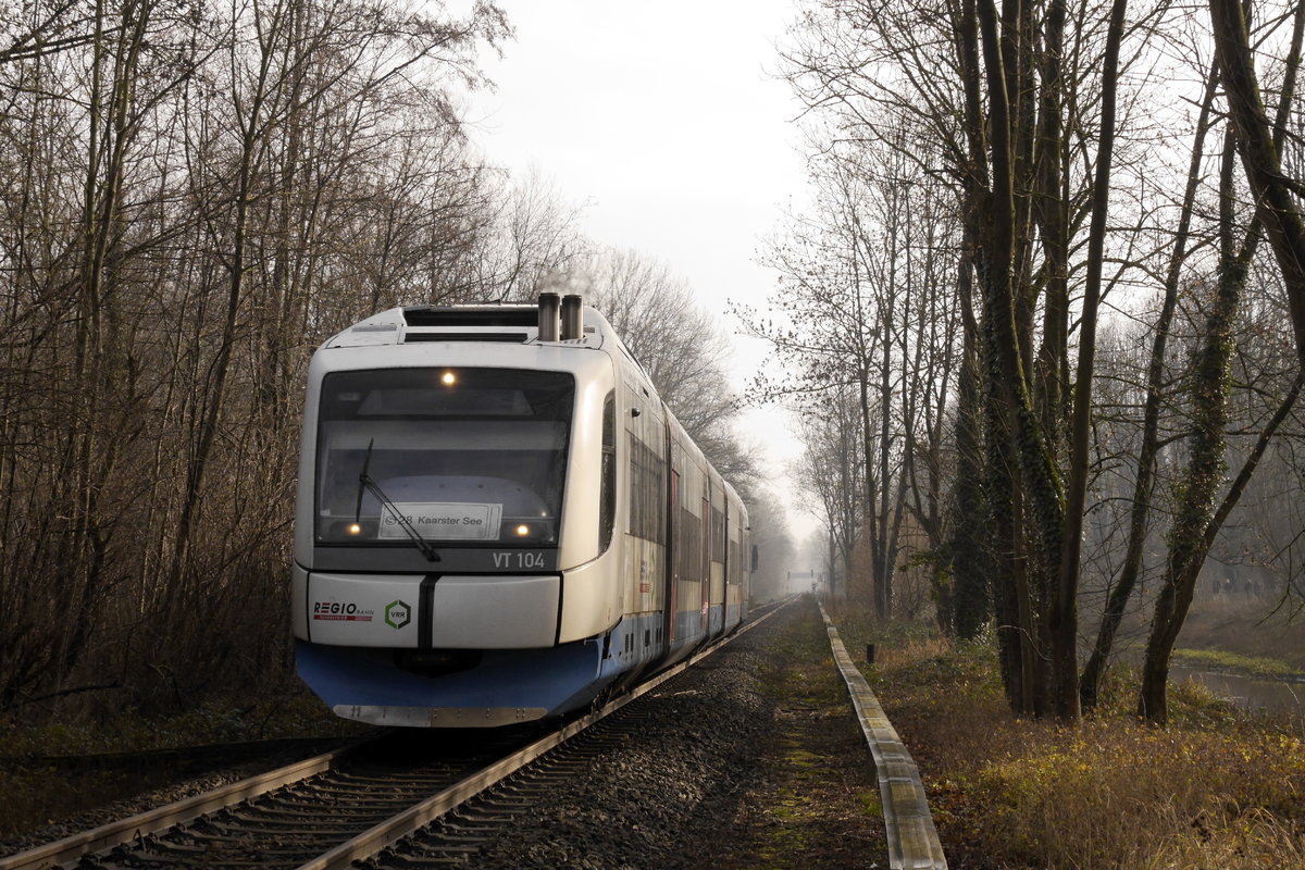 S 28 nach Kaarst am zukünftigen Hp Neuss-Morgensternsheide, 10.1.21. VT 104 trägt immerhin schon Regiobahn- und VRR-Aufkleber. Weitere Anpassungen an den neuen Einsatzbereich haben aber noch nicht stattgefunden.