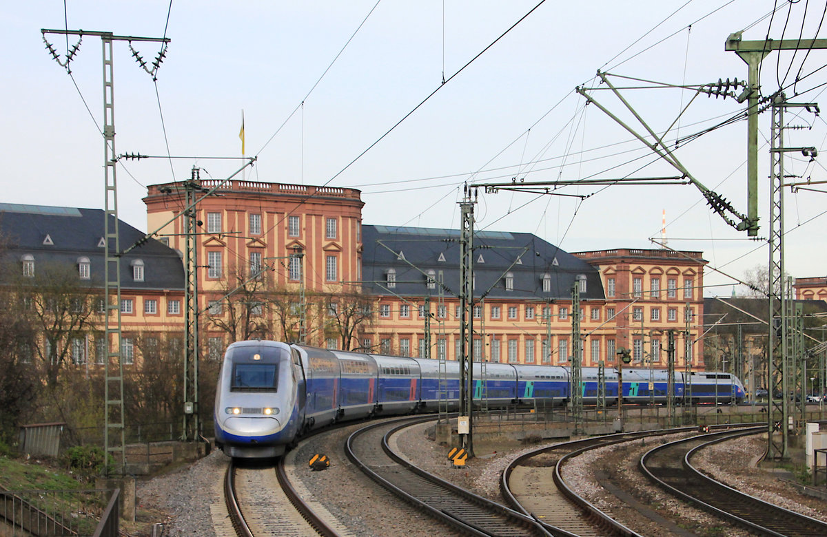 TGV Douplex am 03.04.2015 bei Ausfahrt in Mannheim Hbf Richtung Kaiserslautern ausfahrend.