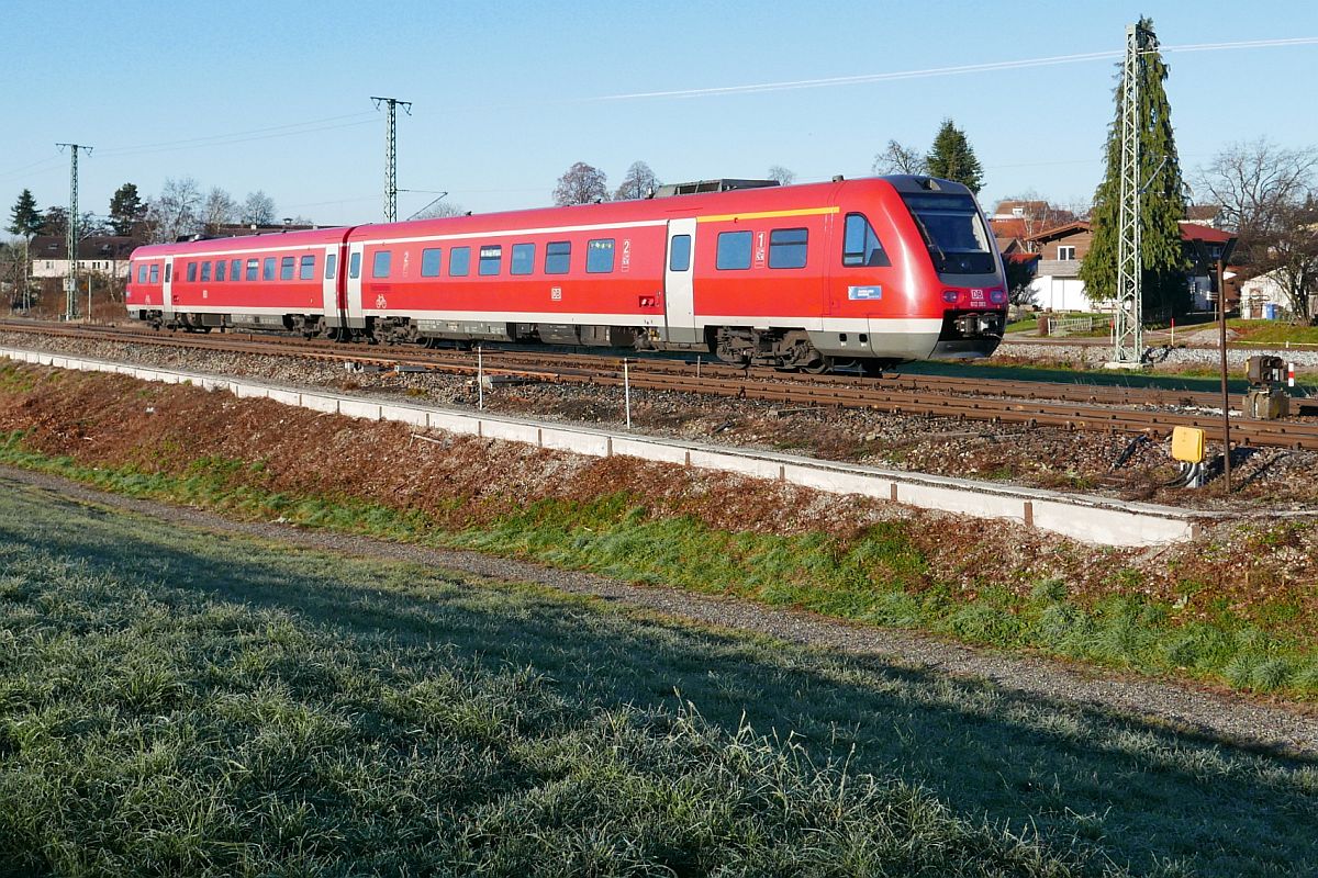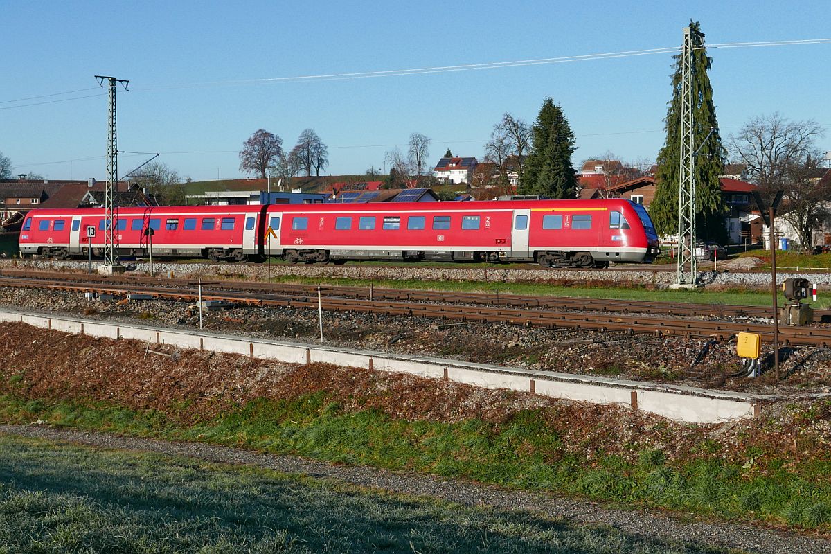 Von Ulm über Kempten und die bayerische Allgäubahn kommend erreicht 612 083 als RE 3983 Hergatz, wo er die Fahrtrichtung wechselt, um das Ziel, Wangen zu erreichen (27.11.2020).