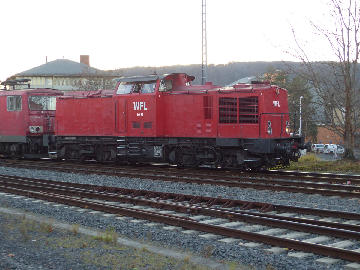 Wedler Franz Logistik LOK 12, 293 021-2 ( 9880 3293 021-2 D-WFL ) schiebt einen Lokzug am 19.12.2020 ins Netz vom Hauptbahnhof Gera.