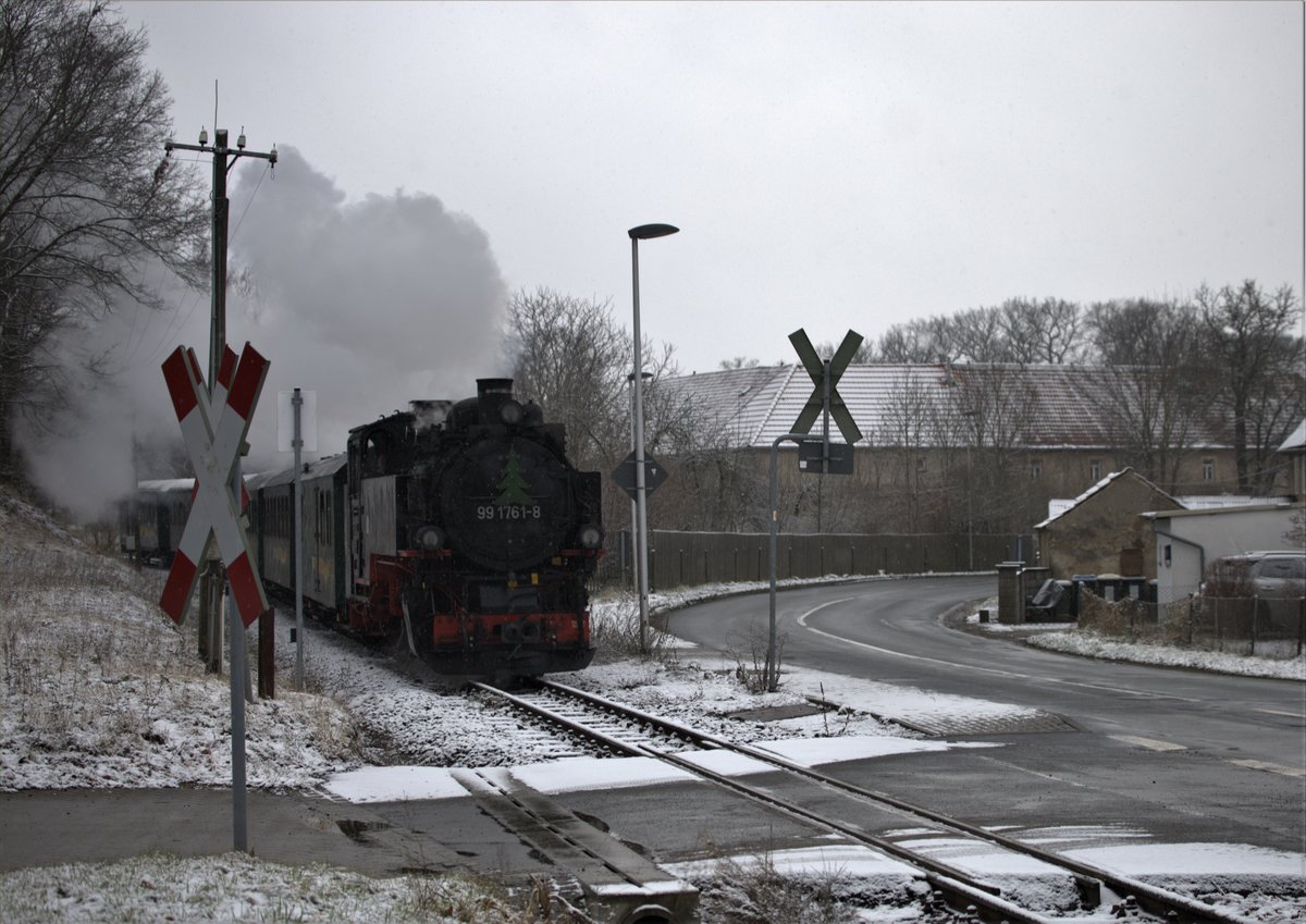 Winterliches Wetter am BÜ in Berbisdorf, kurz vor Radeburg, 99 1761-8 mit einem kurzen,leider wieder fast unbesetzten Zug nähert sich, von Moritzburg kommend.