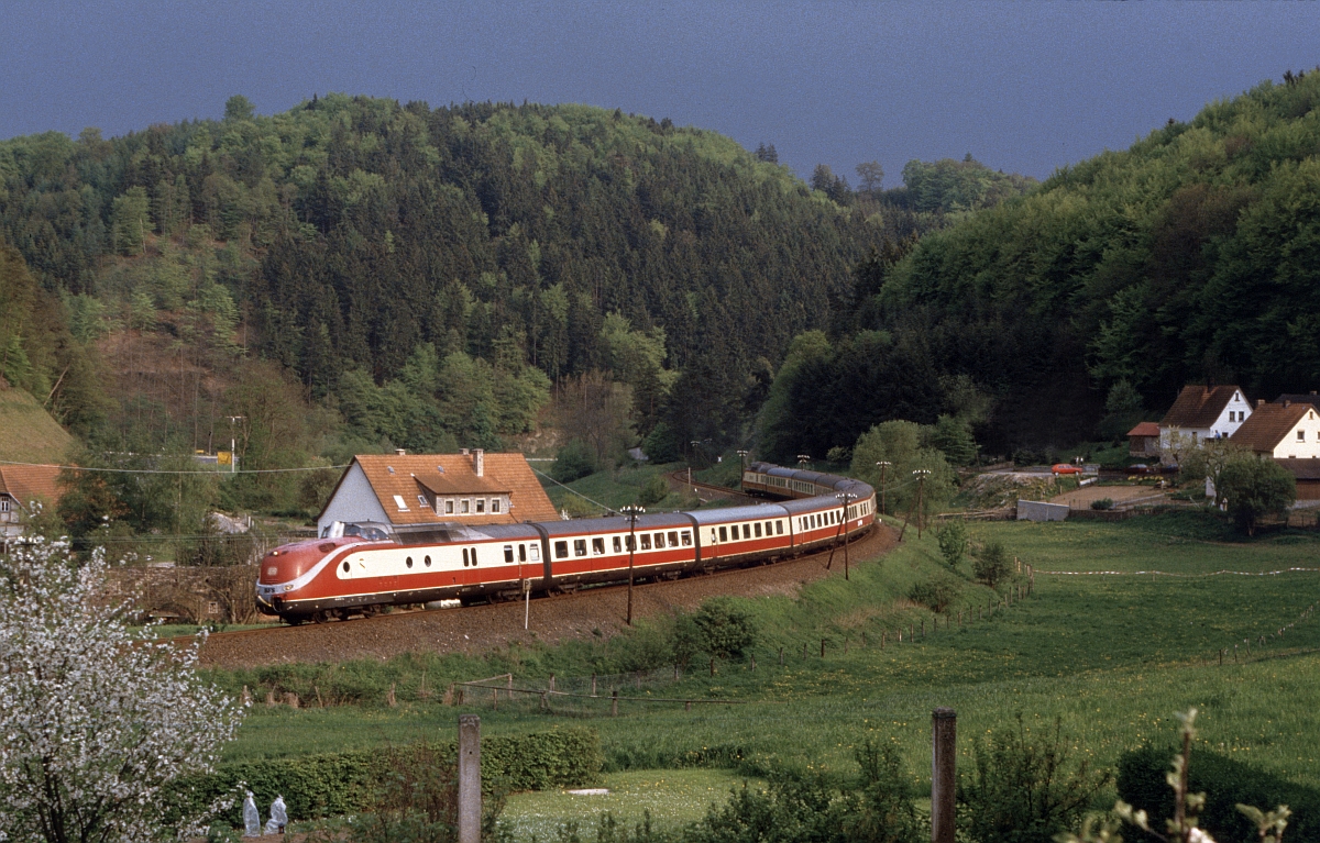Am 19.5.1985  verirrte  sich eine 601-Garnitur im Rahmen einer BFS-Sonderfahrt auf die Strecke Marburg - Korbach, hier vor einer Gewitterfront bei Itter festgehalten.