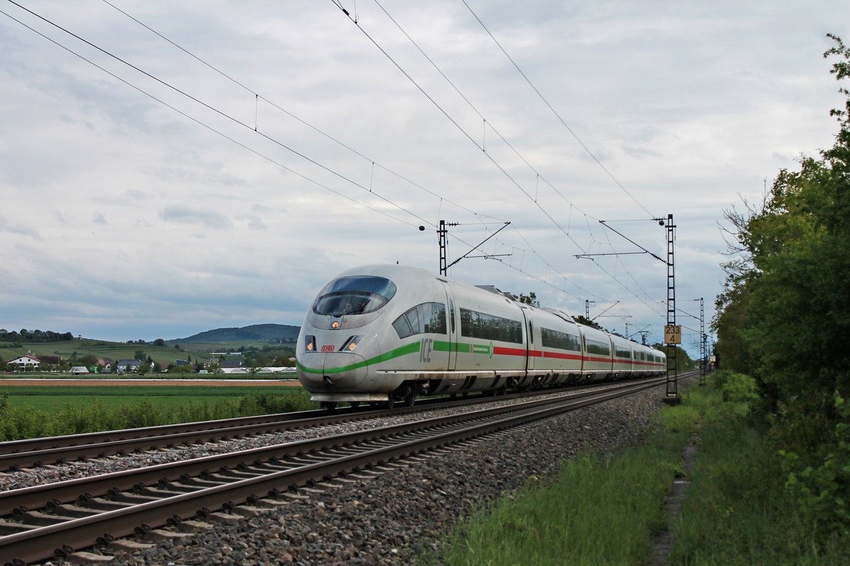 Nachschuss auf 808 015-2 "Bitterfeld-Wolfen", als dieser am späten Nachmittag des 03.05.2020 südlich von Buggingen als ICE 376 (Basel Bad Bf - Frankfurt (Main) Hbf) über die Rheintalbahn durchs Markgräflerland in Richtung Freiburg (Breisgau) fuhr.