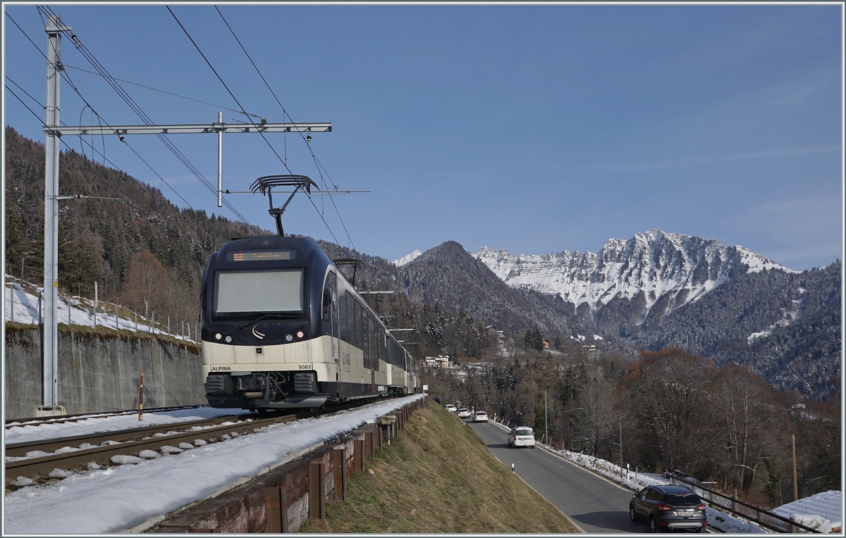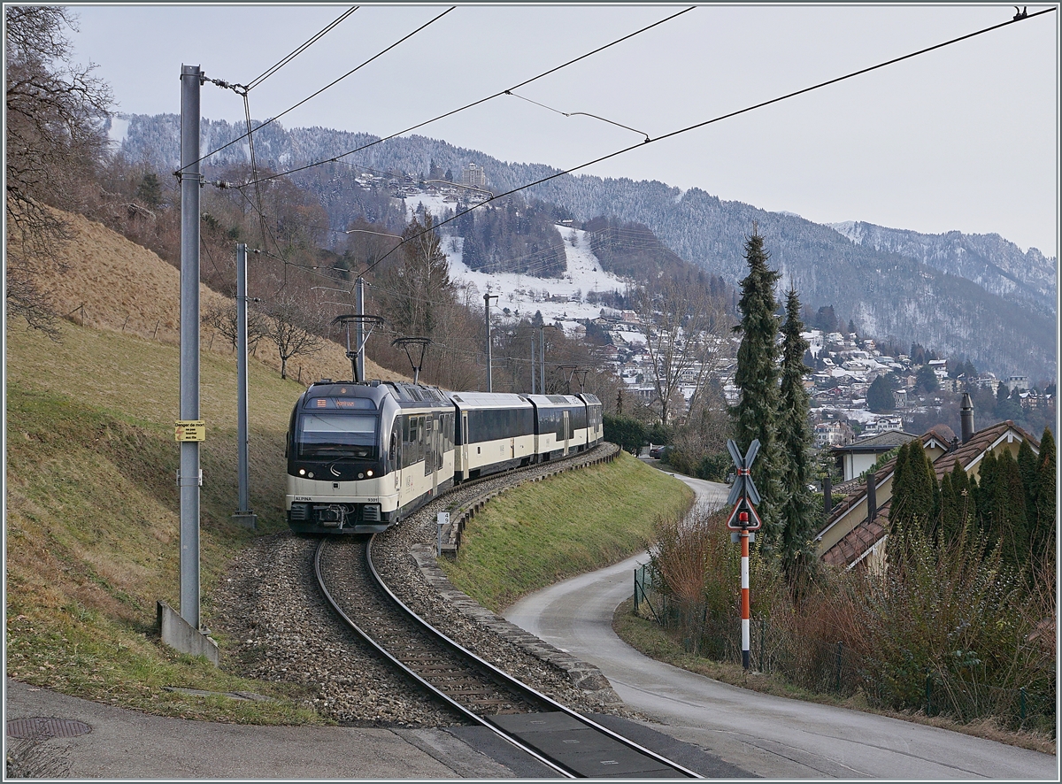 Die beiden Alpina ABe 4/4 9301 und 9201 sind mit einem MOB Regionalzug von Zweisimmen nach Montreux kurz vor Chernex unterwegs. 9. Januar 2021