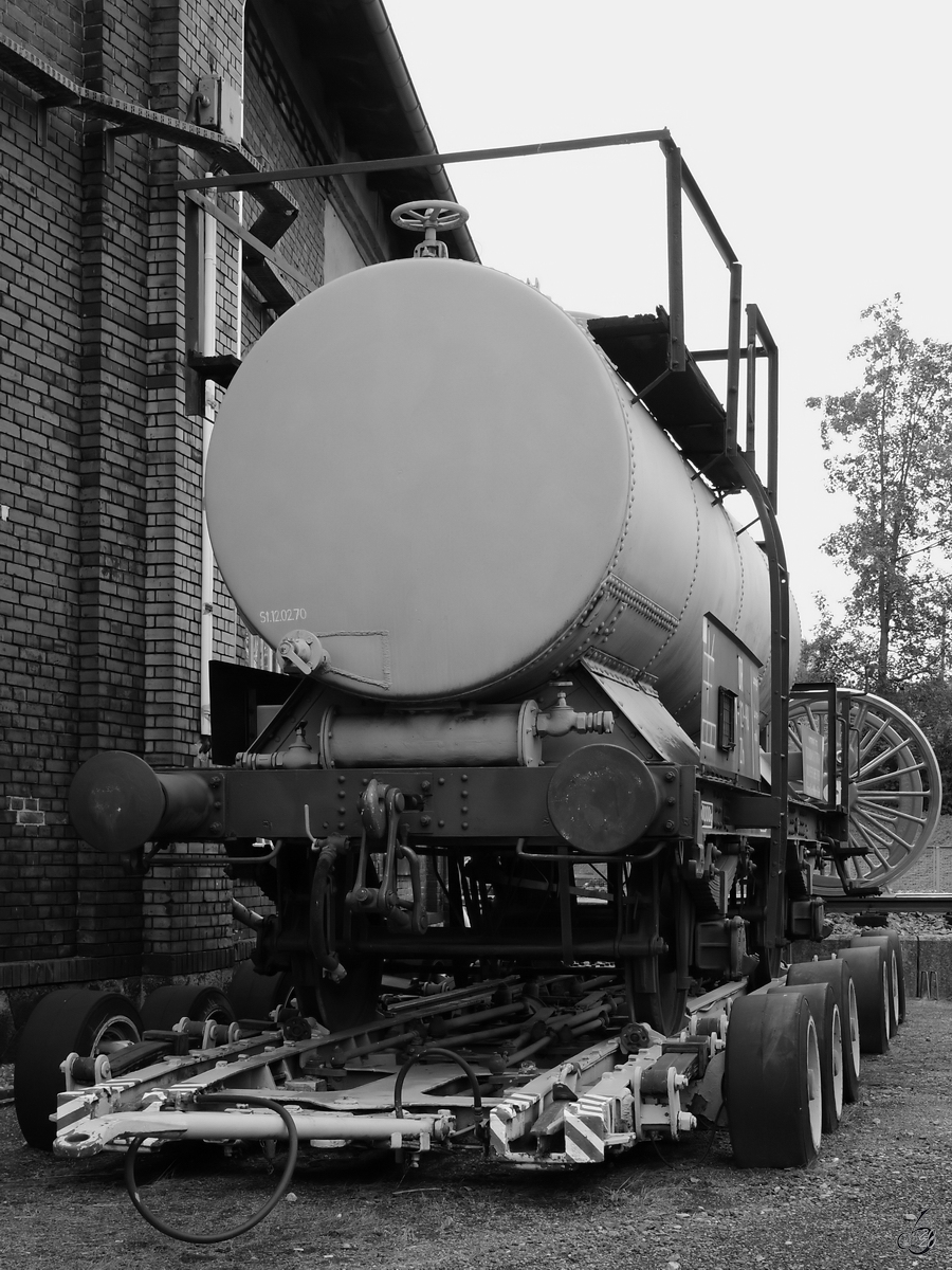 Dieser mit einem Kesselwagen beladene DR-Straßenroller R42 wurde in der Gothaer Waggonfabrik gebaut. (Sächsisches Eisenbahnmuseum Chemnitz-Hilbersdorf, September 2020)
