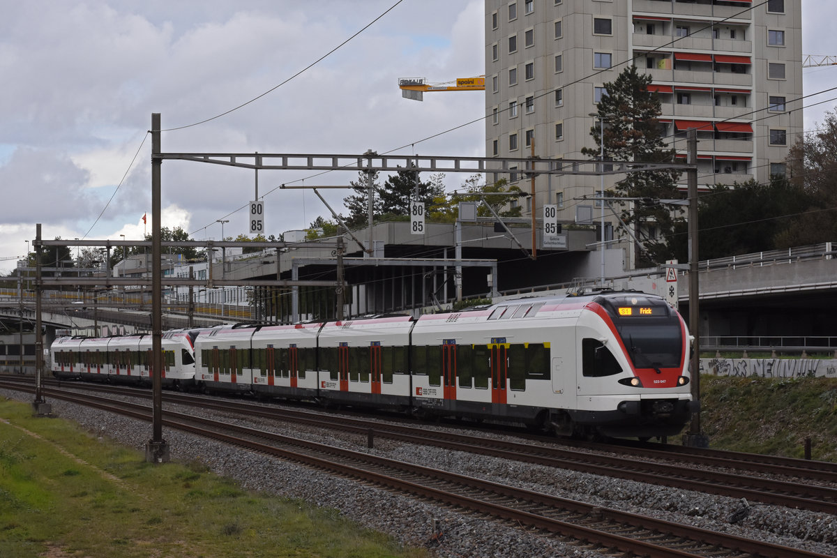 Doppeltraktion, mit den RABe 523 047 und 523 064, auf der S1, fährt Richtung Bahnhof Muttenz. Die Aufnahme stammt vom 10.10.2020.