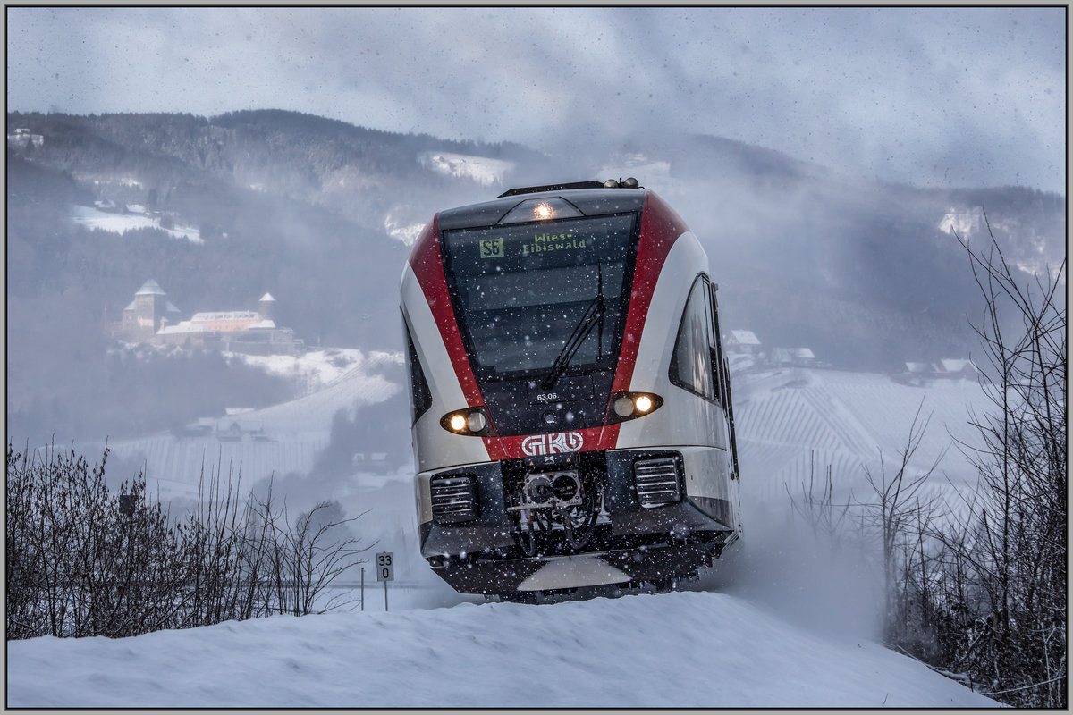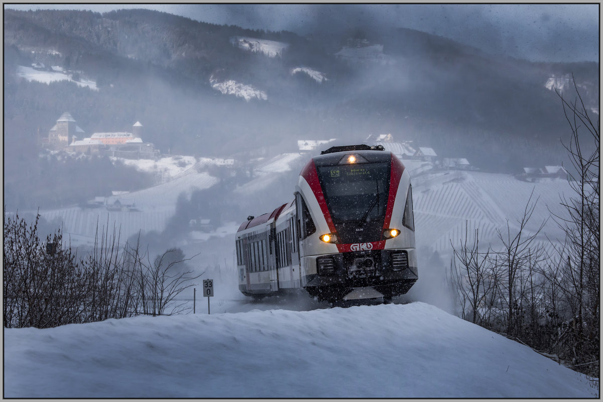 Eine durchgezogenen  Gewitterfront   die in Deutschlandsberg kurze starke Schneeschauer brachte hinterlies zum einen eine flaumige weisse Decke und zum anderen ein Interessantes Lichtspiel der durchbrechenden Sonne. +
