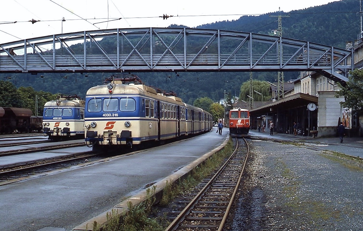 Im August 1982 treffen sich im Bahnhof Bregenz 4030.321, 4030.316 und 2095.07 der Bregenzerwaldbahn, die damals noch bis Kennelbach verkehrte. Da sich der Bahnhof heute völlig verändert präsentiert, habe ich darauf verzichtet, die Geoposition anzugeben.
