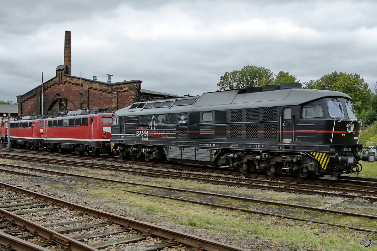 Ludmilla 232 083-6 der Erfurter Bahnservice GmbH und zwei wohl frisch lackierte 140er ohne Beschriftung standen auf dem Gelände des sächsischen Eisenbahnmuseums Chemnitz-Hilbersdorf. (September 2020)