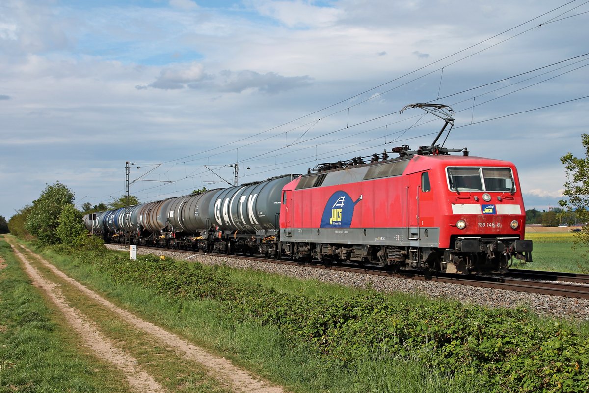Mit dem DGS 42881 (Ingolstadt Hbf - Basel Bad Rbf) fuhr am späten Nachmittag des 03.05.2020 die 120 145-8 von WRS südlich von Buggingen über die Rheintalbahn durchs Markgräflerland in Richtung Schweiz.