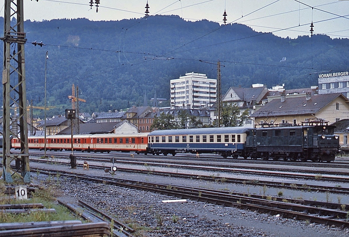 Mit einem Regionalzug aus Lindau trifft 1670.24 im August 1982 in Bregenz ein, an erster Stelle hinter der Lok der DB-Kurswagen Kiel - Schruns