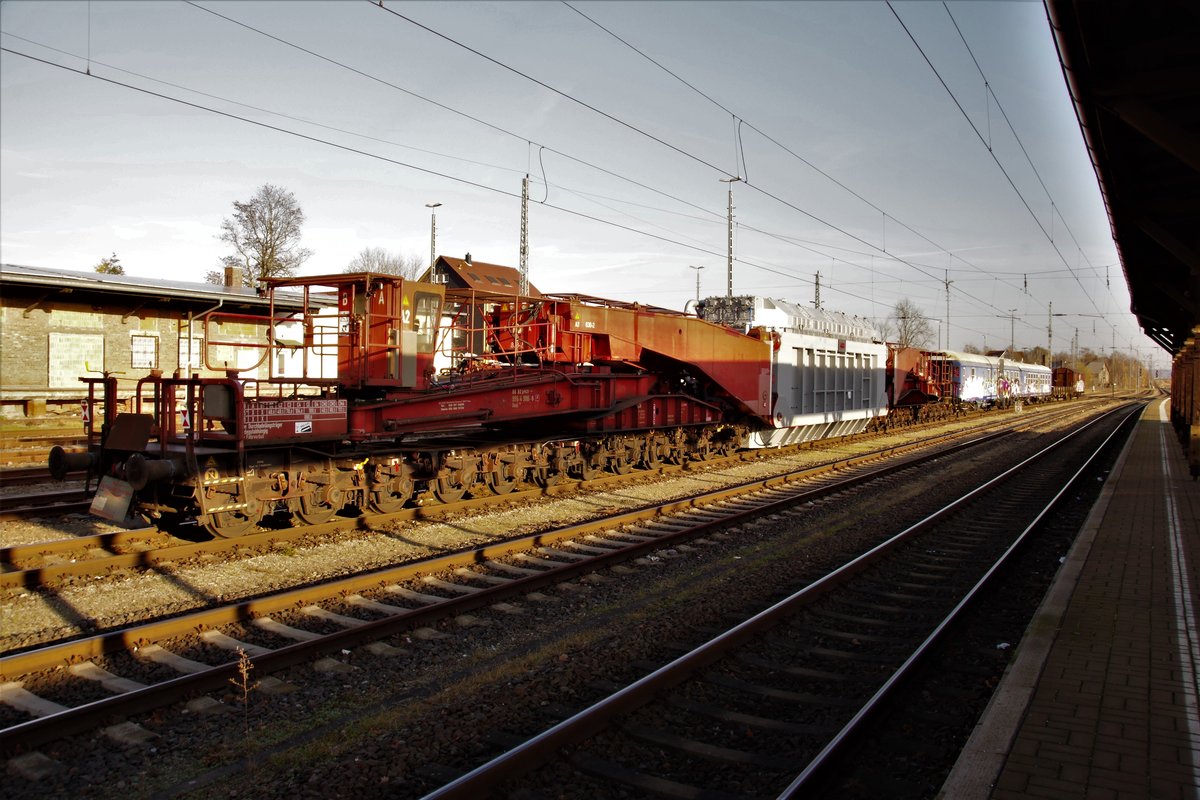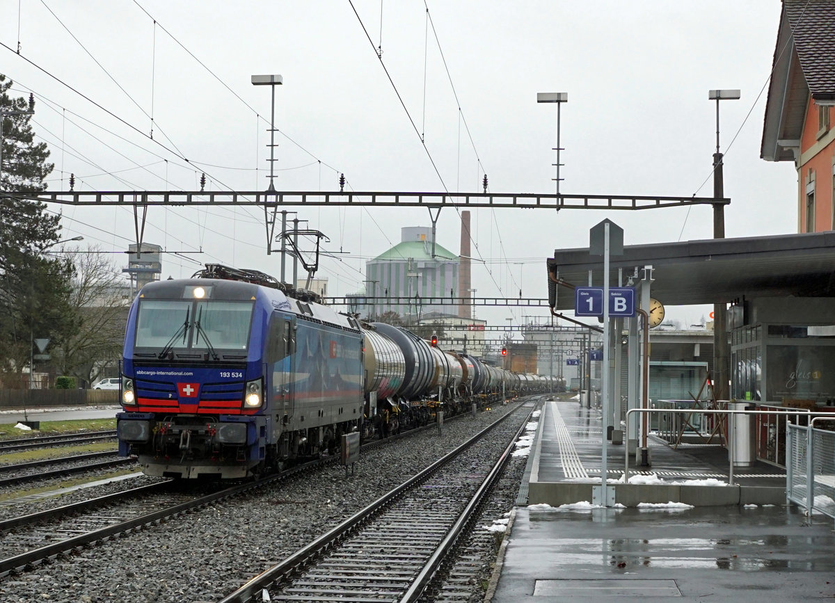 Sirupzug Aarberg-Anklam vom 14. Januar 2021, bespannt mit der Vectron 193 534, im Bahnhof Aarberg zur Abfahrt bereit. Fotostandort Bahnübergang, Bildausschnitt Fotoshop. Foto: Walter Ruetsch