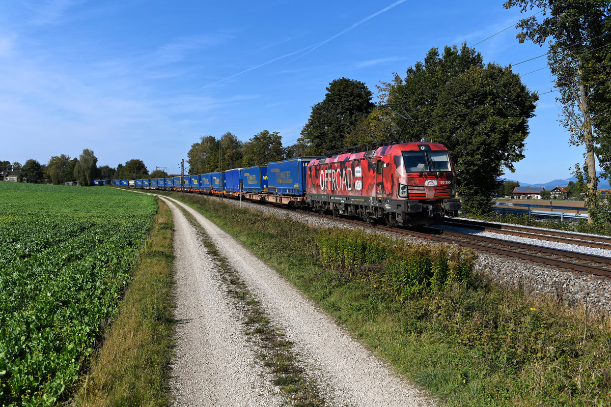 Vor der TXL-Leistung DGS 43949 von Wanne-Eickel nach Wien Freudenau Hafen werden zumeist ELL Vectrons eingesetzt, gerne diejenigen mit der Seitenwerbung  We love to connect . Am 01. Oktober 2020 gab es mit der  OFFROAD  193 555 eine erfreuliche Abwechslung, die ihr Haupteinsatzgebiet im Italienverkehr hat und somit eher selten auf der Donau-Achse zu beobachten ist. Bei Langenisarhofen konnte ich die gelungene Werbelok mit dem zumeist mit Aufliegern der Spedition LKW Walter beladenen KLV aufnehmen.