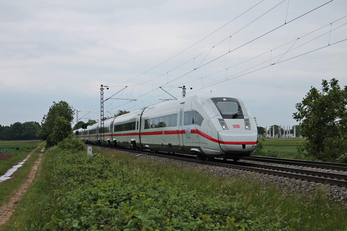 Als ICE 371 (Berlin Ostbahnhof - Basel Bad Bf) fuhr am Nachmittag des 14.05.2020 der 808 021-0 "Lübbenau/Spreewald" südlich von Buggingen über die Rheintalbahn durchs Markgräflerland in Richtung Schweiz.